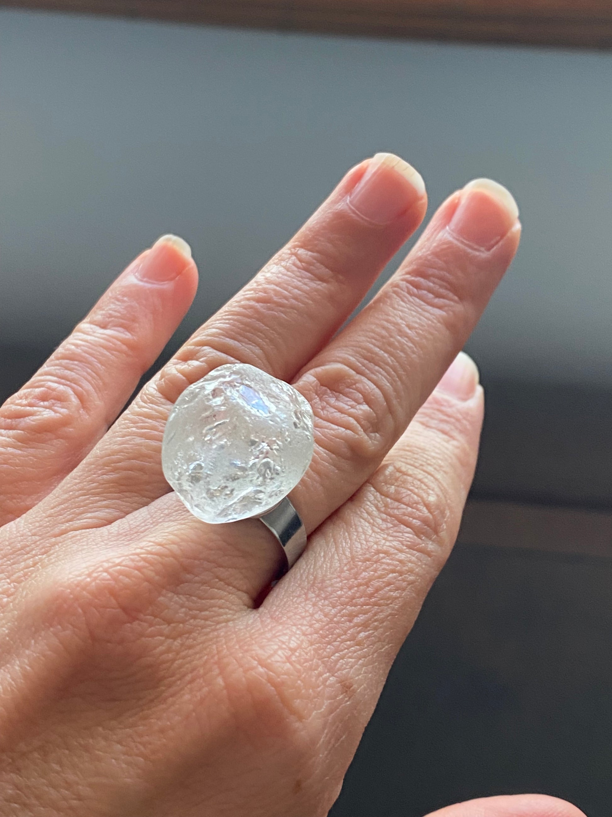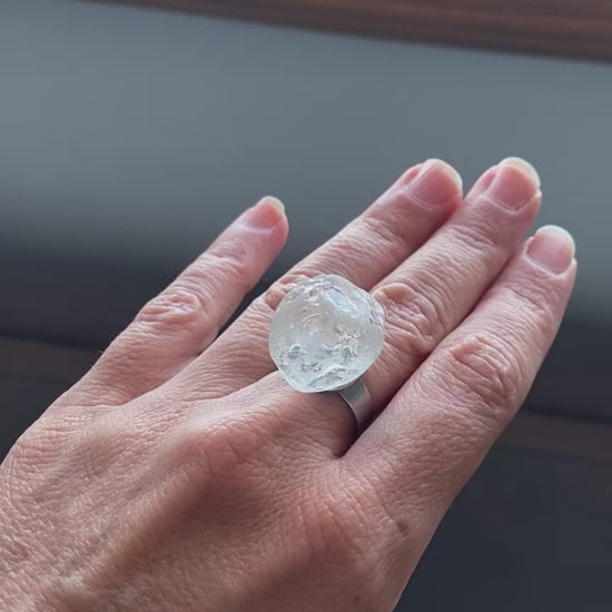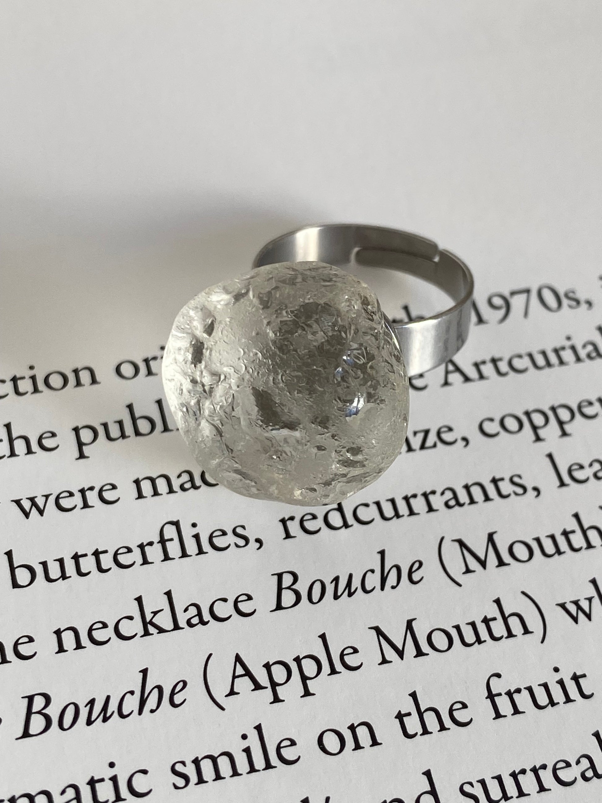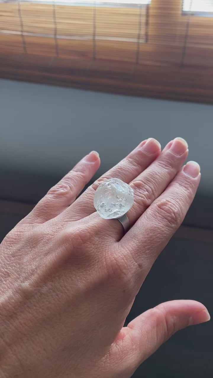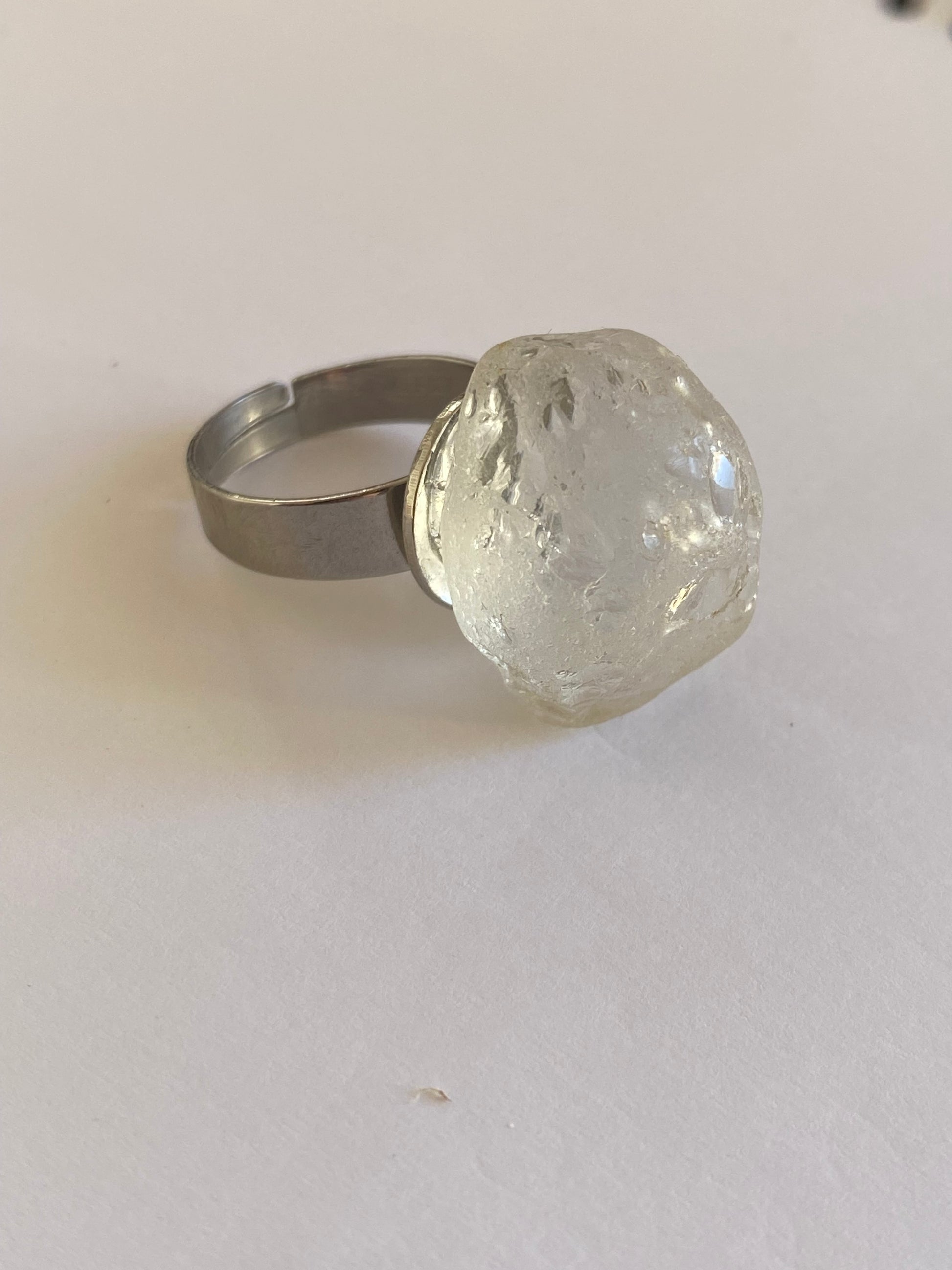 Anillo ajustable color plata de acero inoxidable, con cristal recolectado en la playa de la Barceloneta, tallado por el mar.
