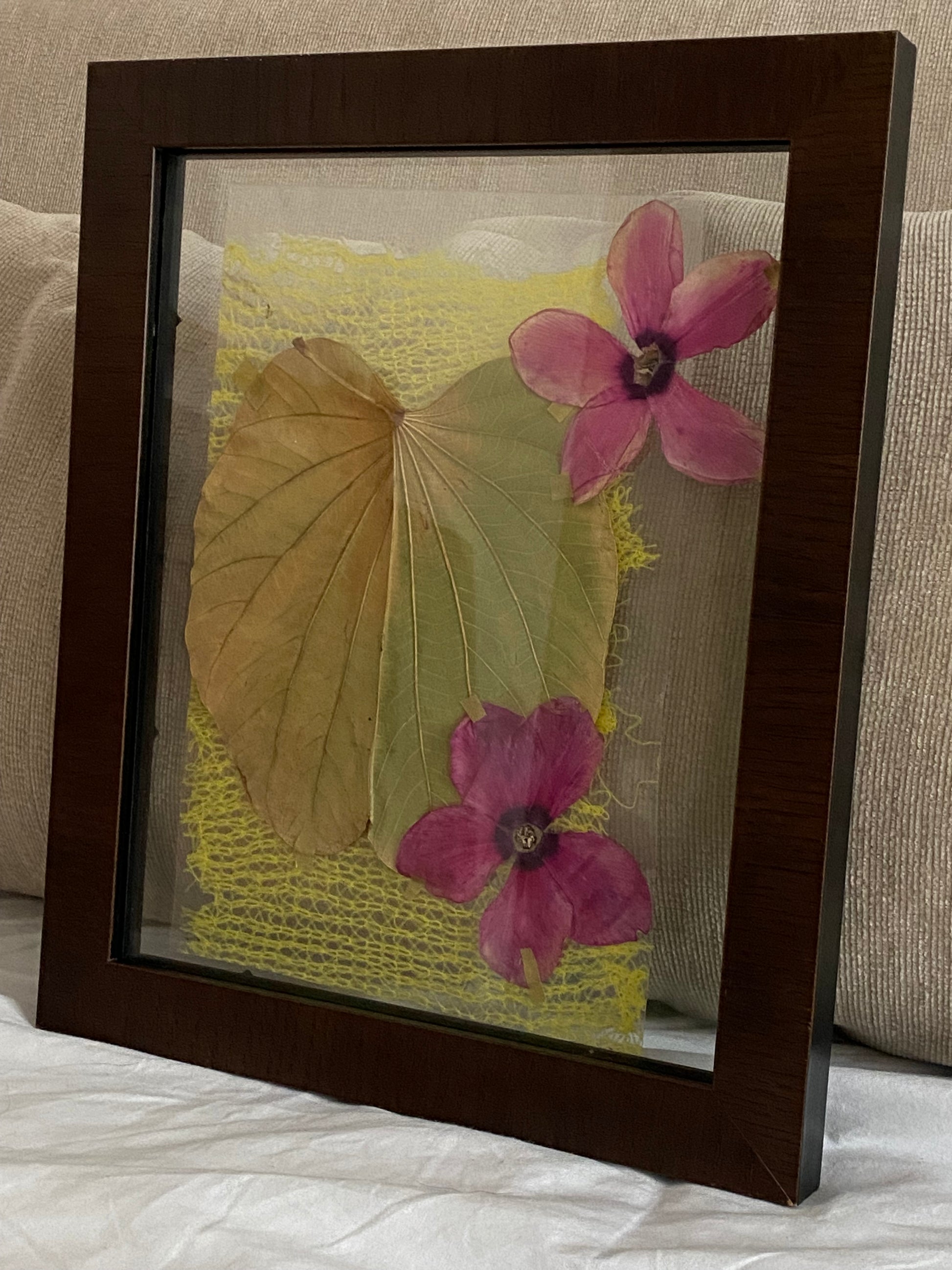 Composición botánica con hoja recolectada en Barcelona y ciclámenes de mi balcón. Usando como fondo materiales reutilizados de redecilla del empaquetado de los limones amarillos.