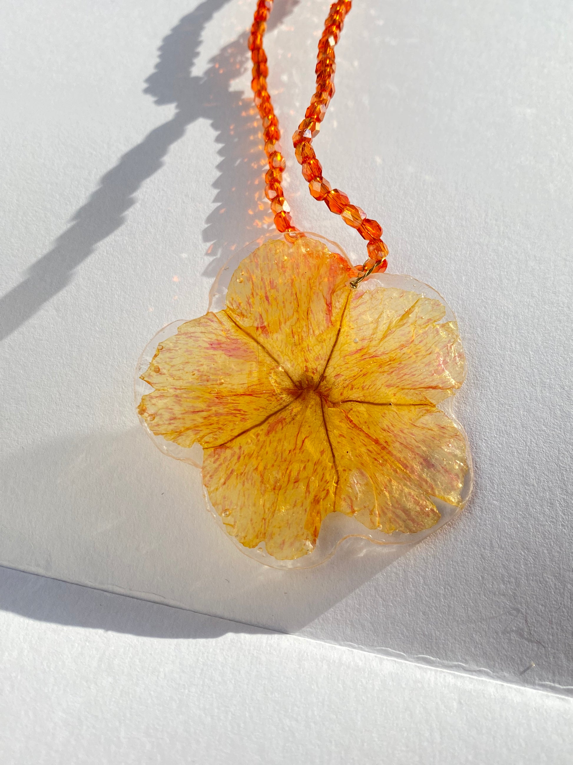 Collar de cristales anaranjados con colgante de flor del puerto de Barcelona encapsulada en resina.
