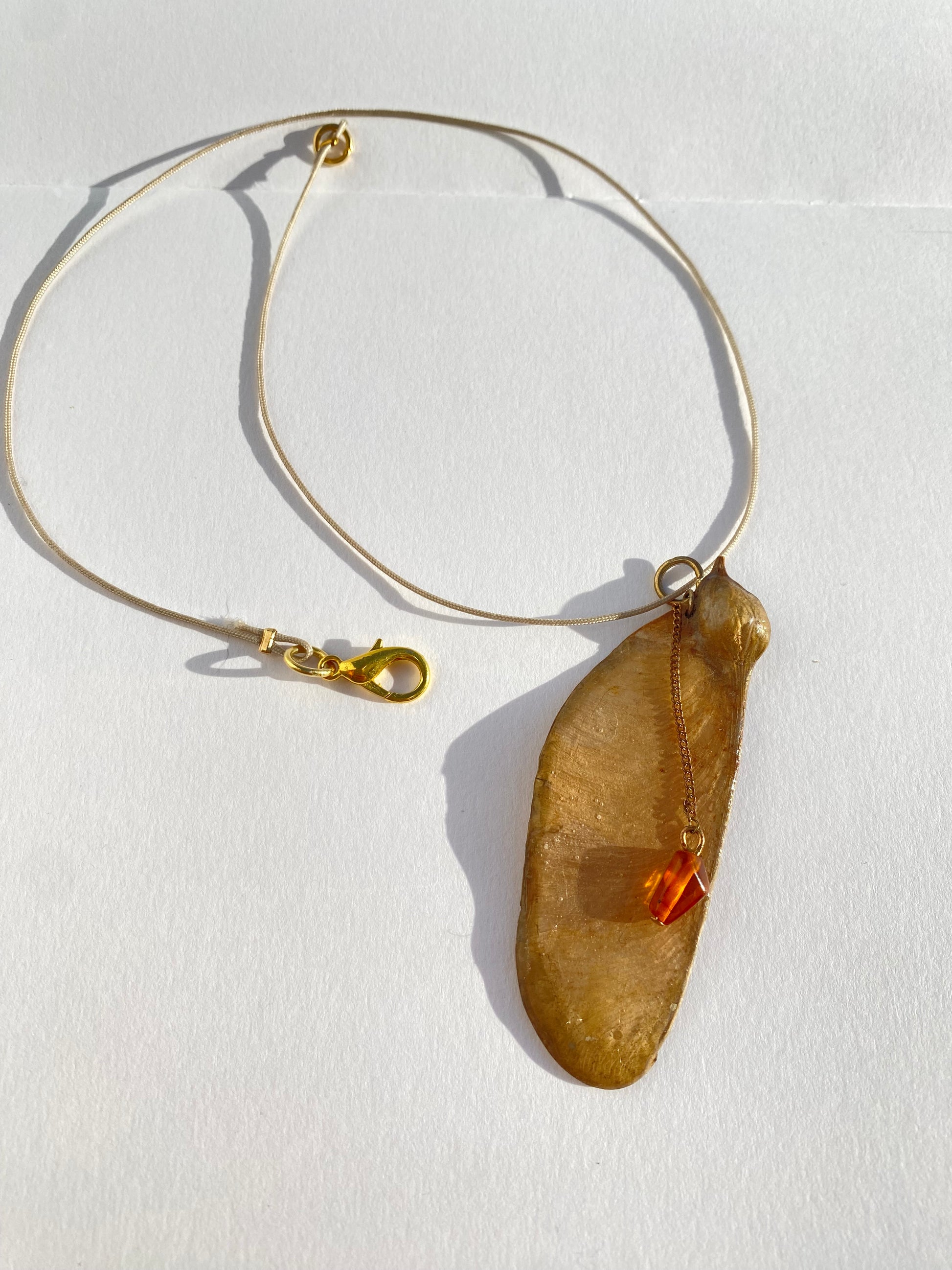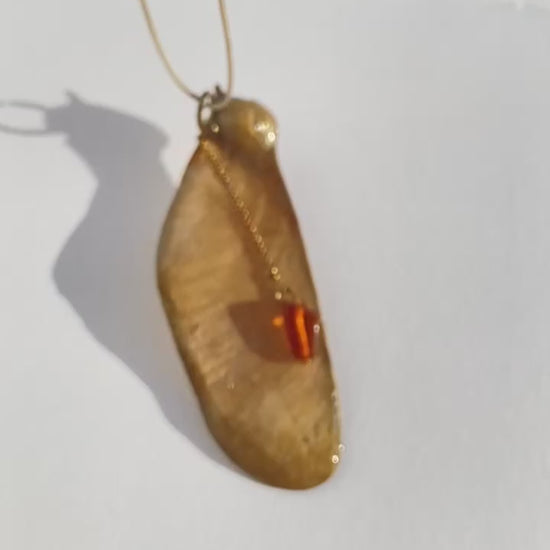 Colgante de semilla voladora encapsulada y pintada a mano, con detalle de Ámbar mexicano. Hecho a mano en mi taller de Olvera, en la sierra de Cádiz.