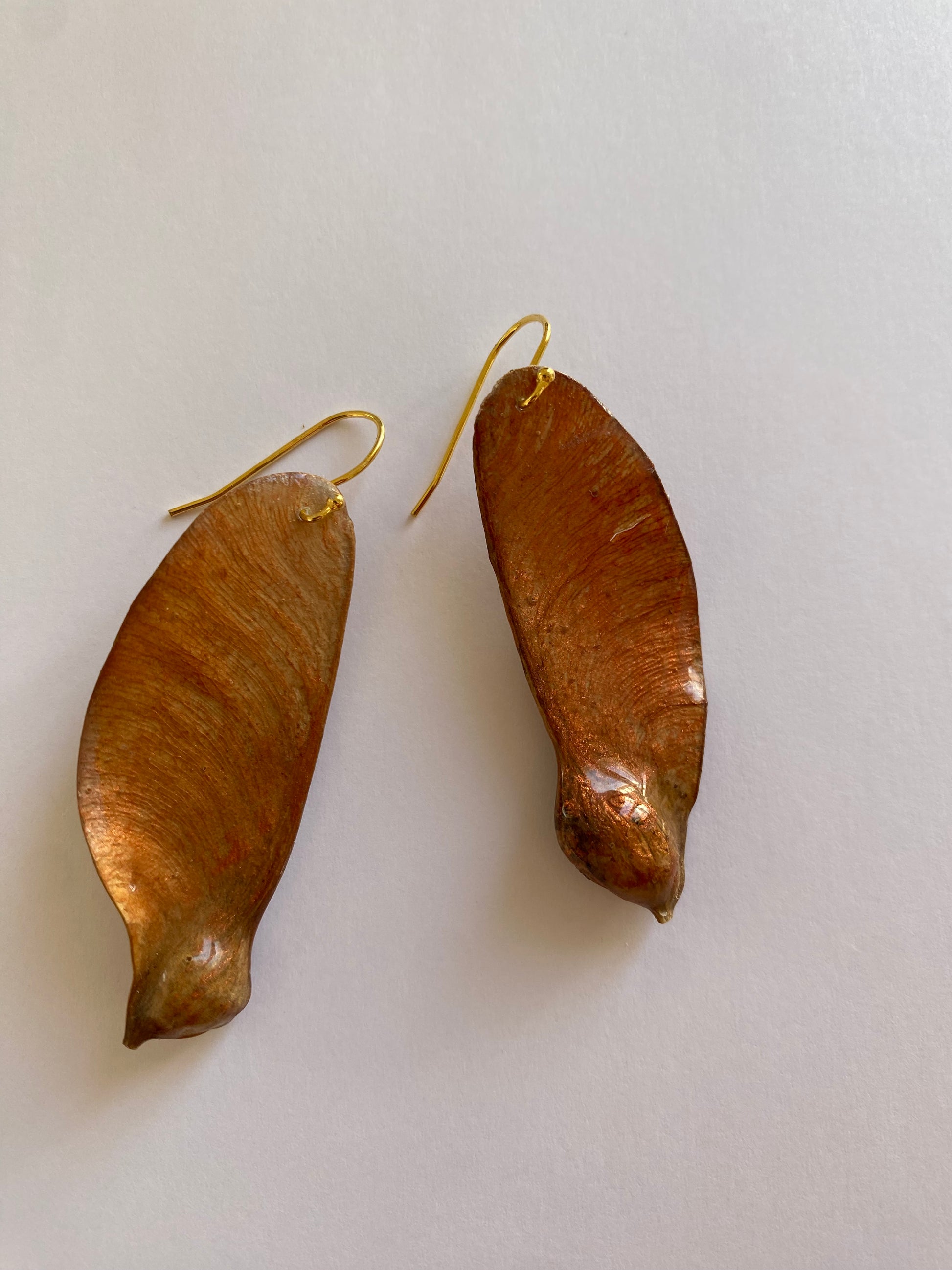 Pendientes hecho de semilla del árbol Tipuana, recogidas en Barcelona, deshidratadas y pintadas a mano en color cobre, finalmente encapsuladas en resina. El gancho del pendiente es de plata chapada en oro.